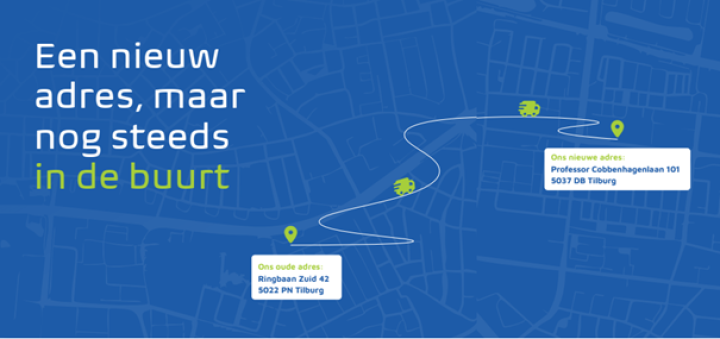 Nadat we 10 jaar met plezier vanuit onze huidige locatie aan de Ringbaan Zuid hebben gewerkt, zetten wij een volgende stap naar een nieuwe werkplek. Begin 2026 verhuizen wij met ons hoofdkantoor naar een nieuw pand in Tilburg. De nieuwe locatie is groter, moderner en met ruimte voor groei. Vanaf 1 februari 2026 zijn we bereikbaar op ons nieuwe kantoor aan de Professor Cobbenhagenlaan 101, 5037 DB Tilburg.